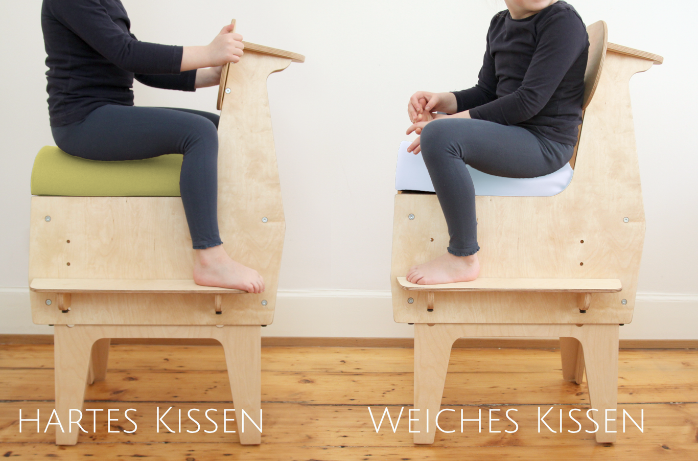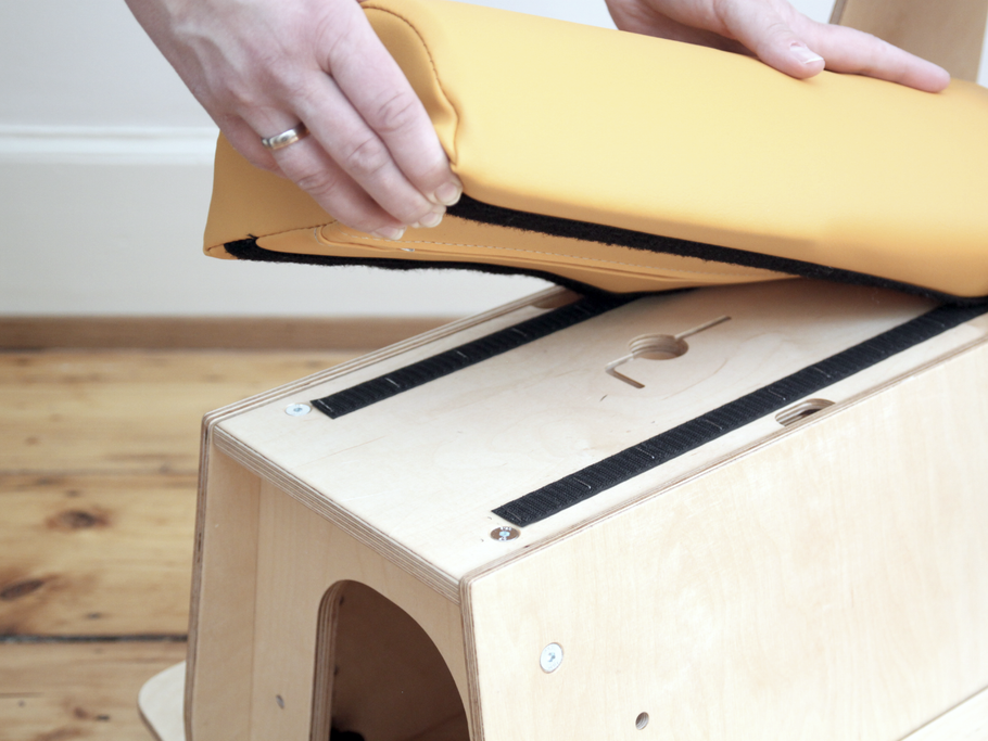 Für den Rückwärtsreiter stehen drei verschiedene Polster zur Verfügung, die ganz einfach per Klettband gewechselt werden können – ein hartes, ein weiches und eines, das an einem Ende hart und am anderen weich ist. Damit lässt sich zum einen die Sitzhöhe etwas anpassen, zum anderen ermöglicht es, auf die unterschiedlichen (therapeutischen) Bedürfnisse des Kindes einzugehen.