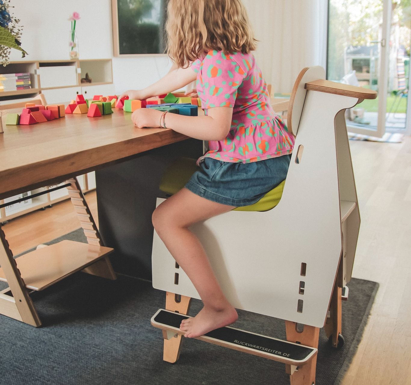 Der Rückwärtsreiter ermöglicht Kindern mit unterschiedlichen Diagnosen, selbstständig, frei und ruhig am Tisch zu sitzen.